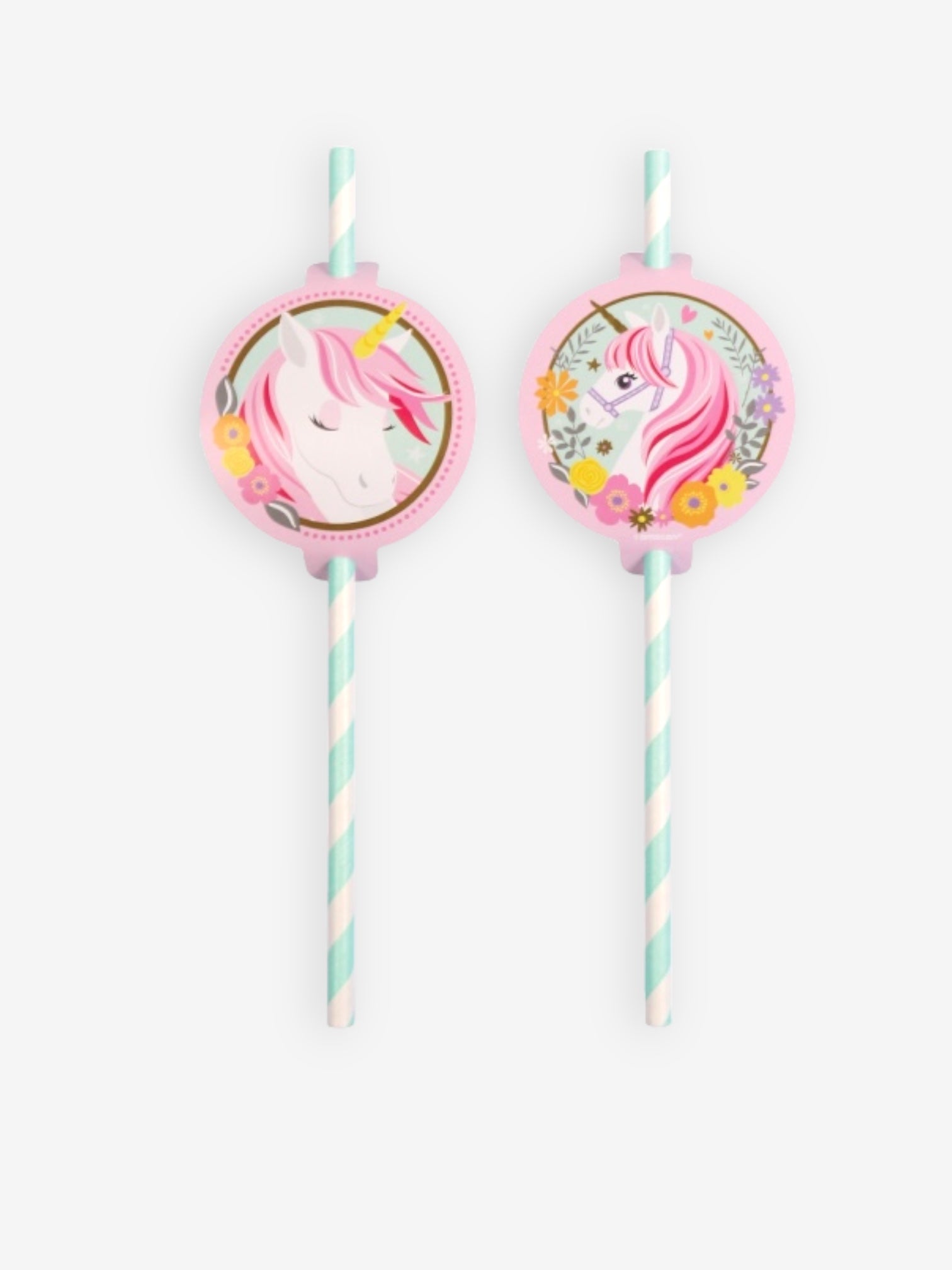 - Dessa sugrör är dekorerade med runda pappersfigurer med olika enhörningsmotiv, vilket gör dem till ett lekfullt och festligt tillskott till kalaset.
